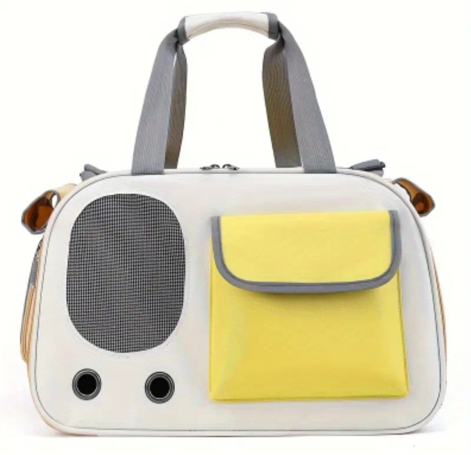 Transportador estilo cápsula espacial, transpirable y cómodo. Colores:Amarillo, verde y negro.